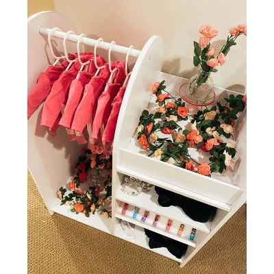 The Fashion Pretend Station in white by KidKraft keeps all your little diva’s accessories and costumes organized and ready for play. Dress-up time is more magical when you can clearly see all your clothes, jewelry, shoes and accessories all in one height-right furniture storage piece. Standing at over two-and-a-half-feet tall, this kid-sized setup has storage compartments to keep all their make-believe toys and accessories together. Hang clothes on the bar, display shoes, tiaras or makeup on the angled shelves. Loop scarves, necklaces, boas and more on the pegs on the side for last-minute additions to perfect the look. The shatterproof safety mirror lets kids make sure their costume is perfect.